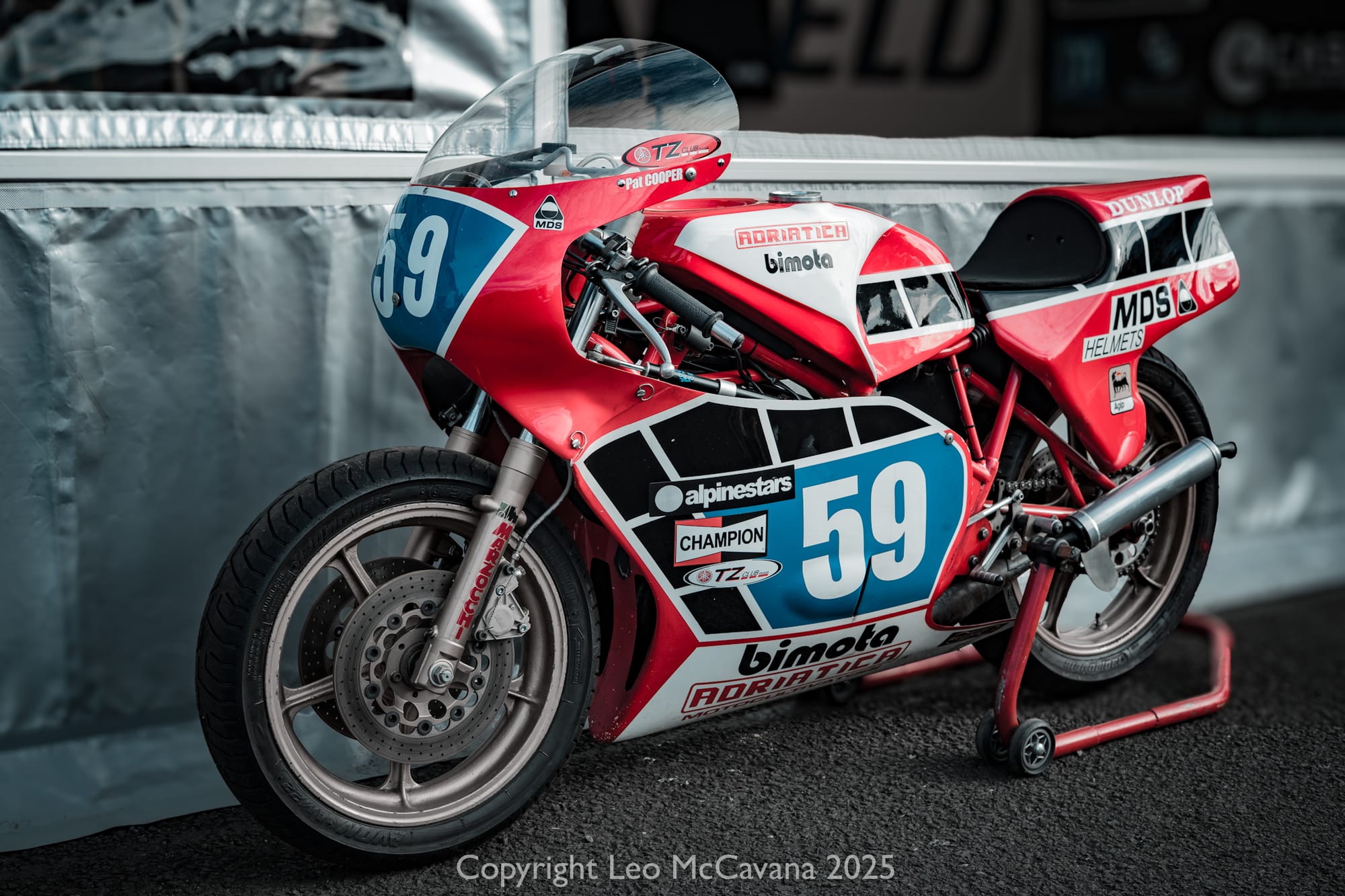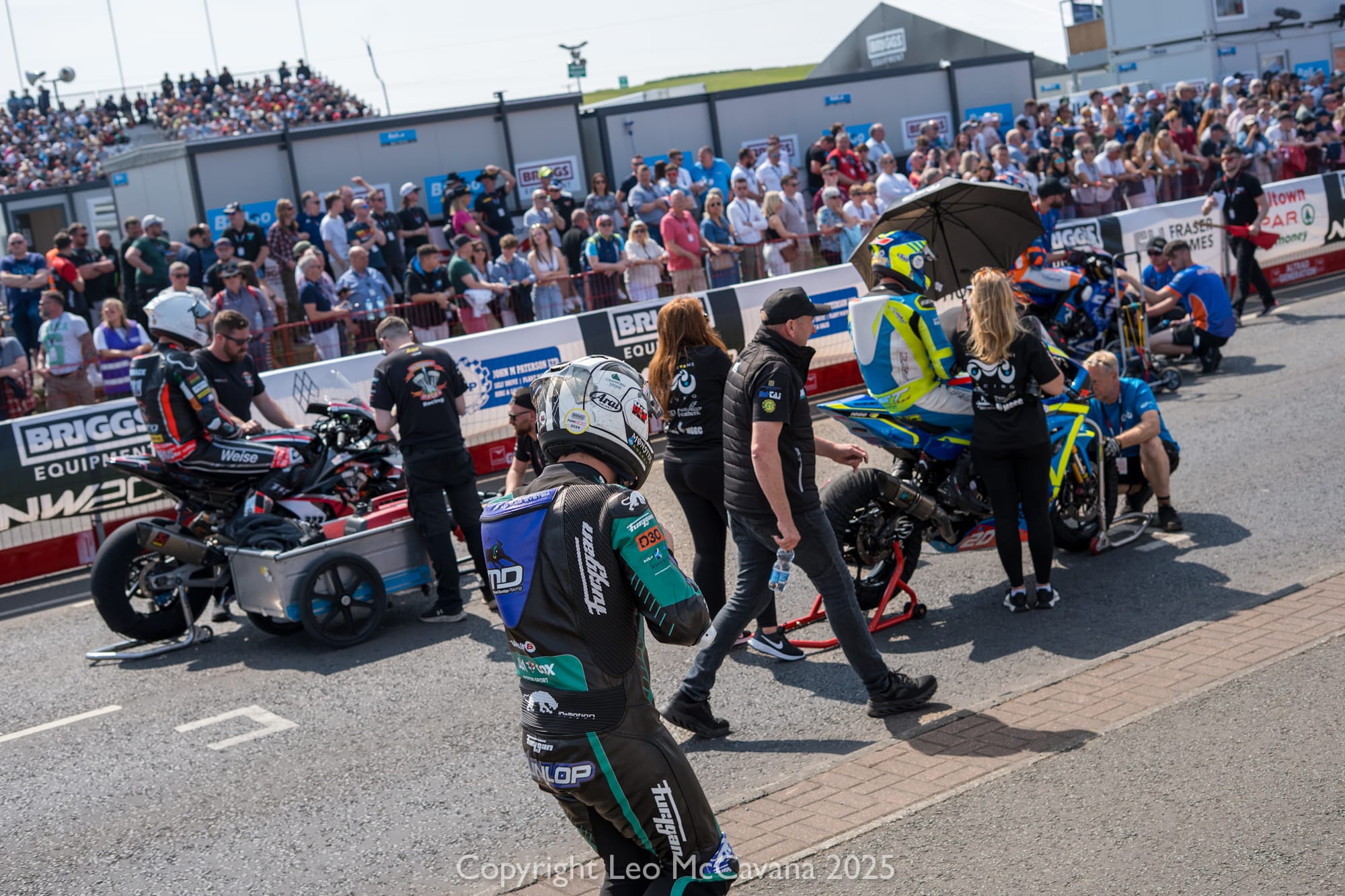 Soon it’s time to race. All kitted out in his leathers and with the helmet fastened on, he’s ready for business as he strolls up the grid. Casting glances at competitors and their machinery before he mounts his bike.